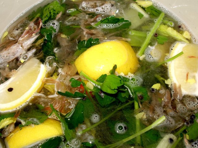 put all the ingredients in a small stock pot and cover with about 8 cups of cold water. bring to a simmer and skim off the foam that rises to the top. continue to simmer for 45 minutes. strain through a fine mesh strainer or chinois. at this point, you can cool and freeze the stock or keep it warm on the stove and use it right away. you can still freeze whatever stock you have left over. i ended up using half of my stock for the risotto tonight and freezing the other half for shrimp bisque that i will share with you in a future post!